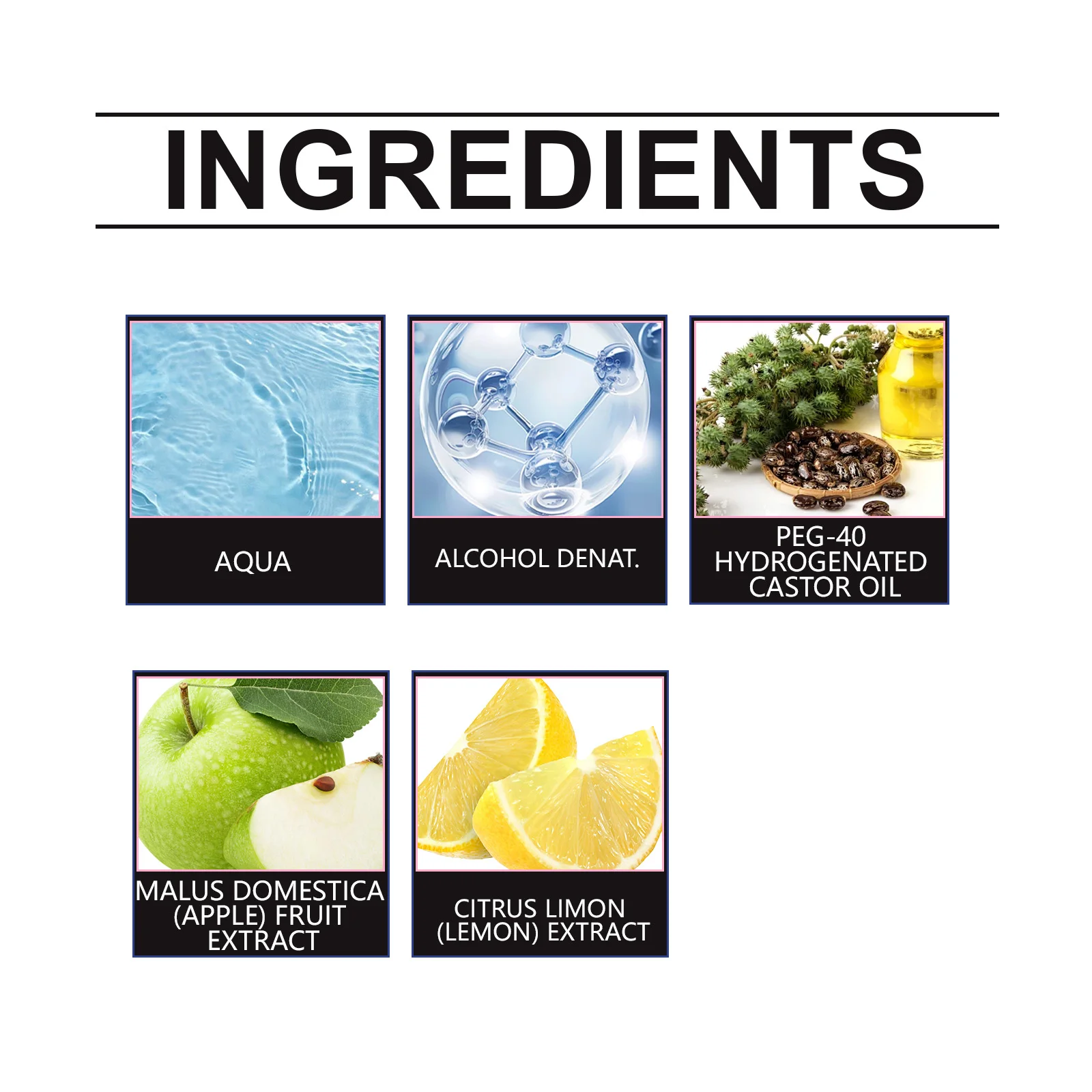 Ingredients: Water, alcohol denat., PEG-40 hydrogenated castor oil, apple extract, lemon extract