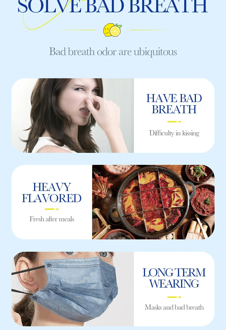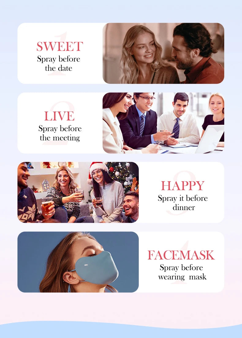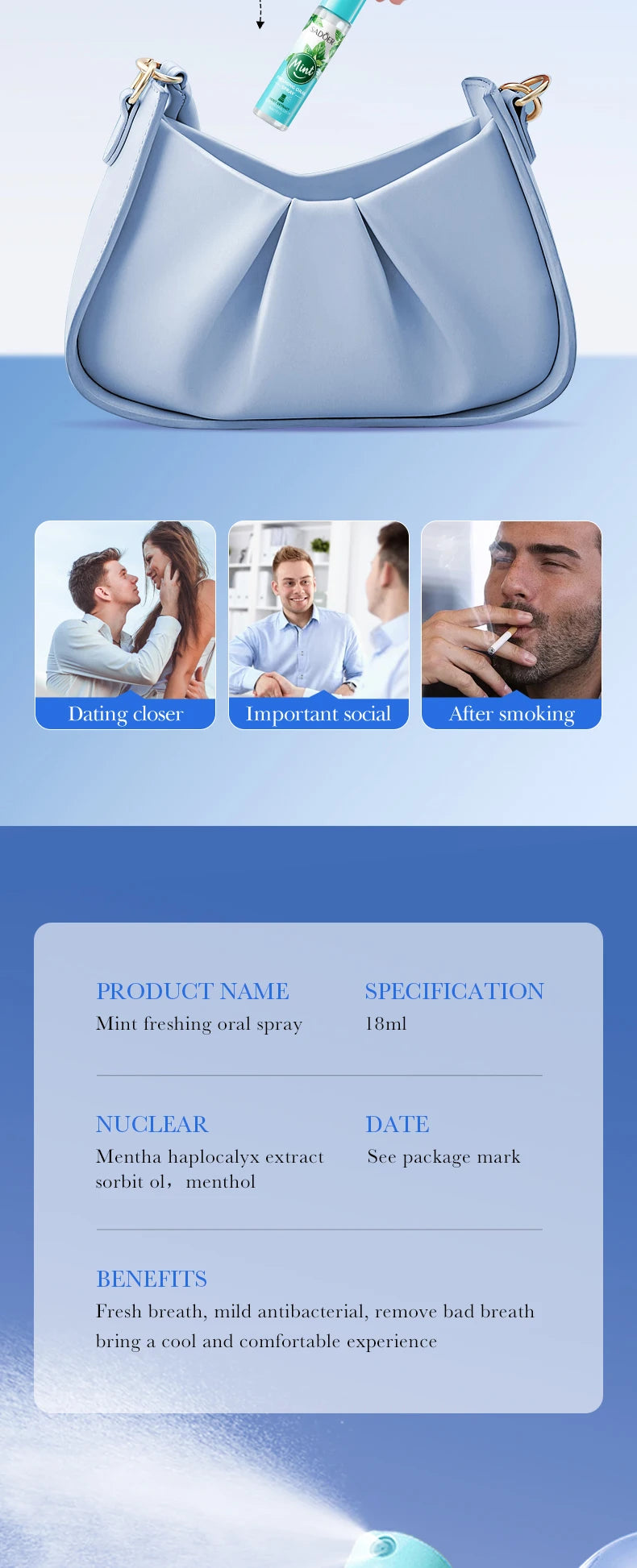 1.Fresh Breath: Our Mint Oral Care Spray reliably relieves and suppresses bad breath in just one spray, leaving a pleasant clean feeling in your mouth.