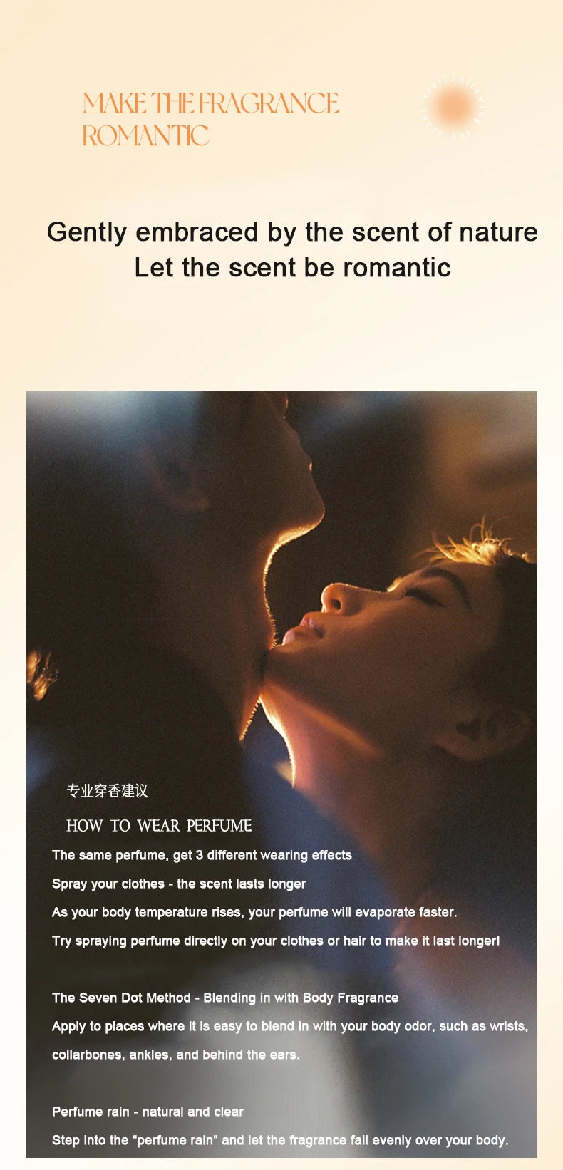 then stand in the fragrance mist, so that the perfume can fall evenly on the body, leaving a light fragrance.