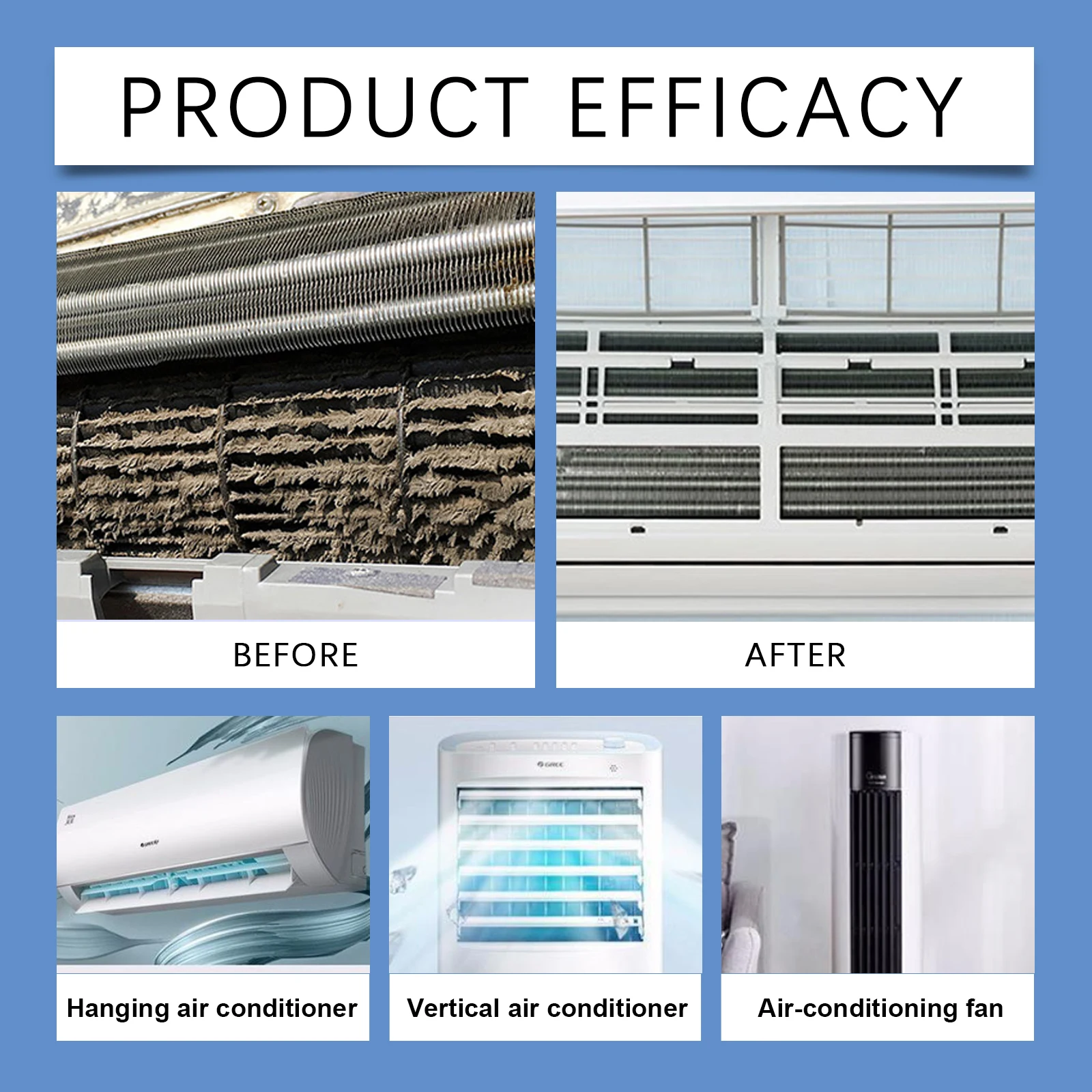 3. Shake well before use, spray the cleaning agent evenly on the filter and air conditioning fan, effectively clean stubborn stains, sterilize and inhibit bacteria, and refreshing and deodorize.