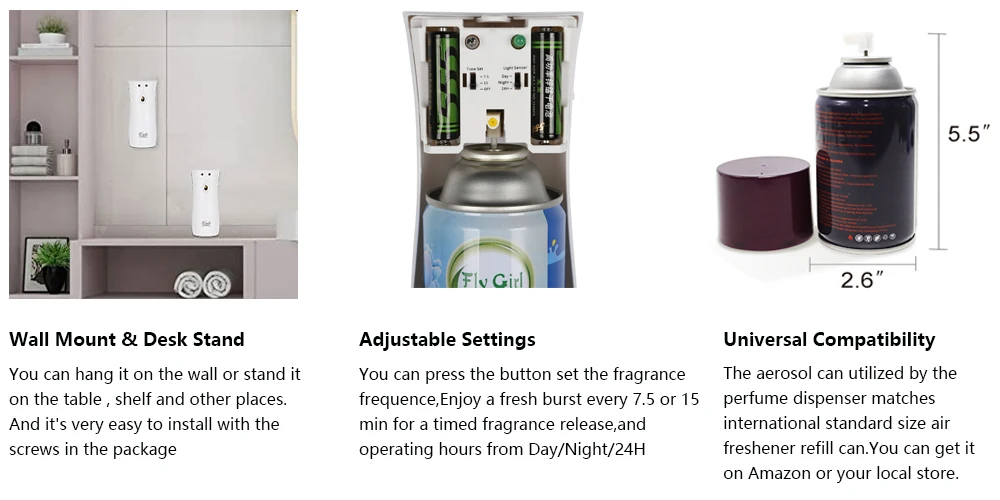 【Universal Compatibility】The aerosol can utilized by the perfume dispenser matches international standard size air freshener refill can,Compatible with Glade, AirWick, Rubbermaid etc air freshener within 10 oz,you can get the suitable fragrance easily on Amazon or local store.