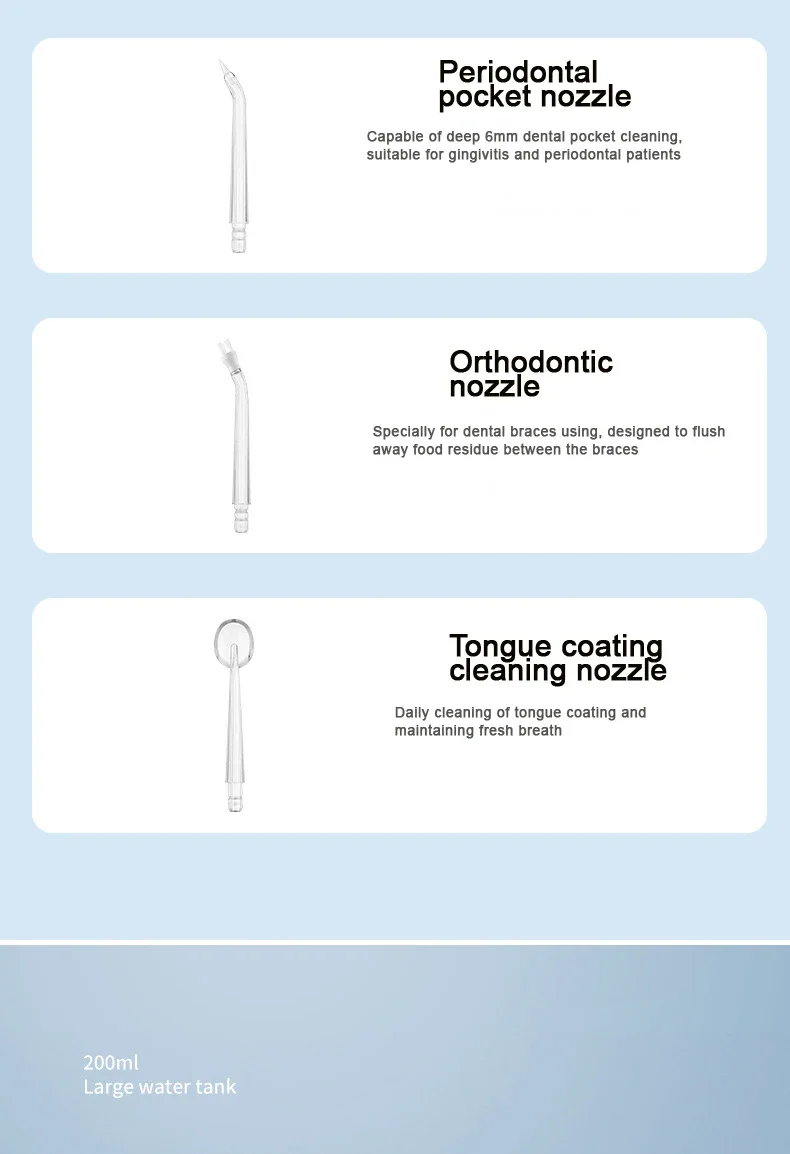 1. The dental water flosser can efficiently reduce food residue, germs and dirt, helping people improve