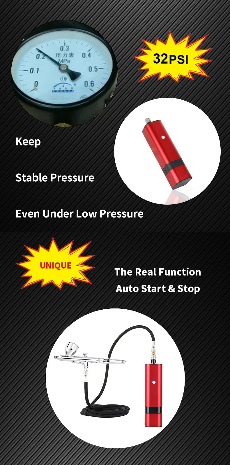 Our airbrush paint kit the pressure has increased by 50% compared with similar airbrush makeup kit on the market, it is higher up to 32psi and the air flow reaches 7-10L. So our airbrush kit can spray more liquids or pigments. Exquisite atomization and fine lines, delicate and uniform.